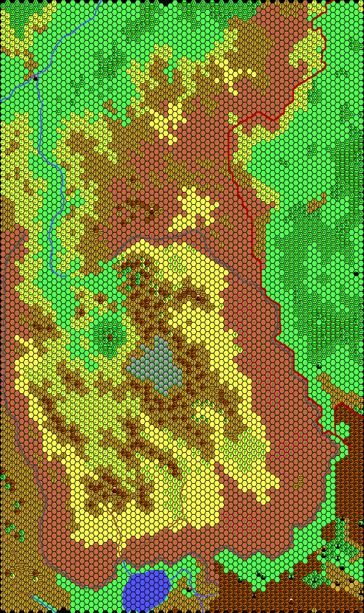 In mid 2001, Thibault developed this version of the Adri Varma plateau at 8 miles per hex using all the available sources of the area. It was the first time for anyone to map the plateau at this scale, and as such has held a tremendous influence on all successive maps of the area. Thibault’s flair for adding detail is in full force, with numerous little additions to fill out the terrain and give meaning to the change in scale.