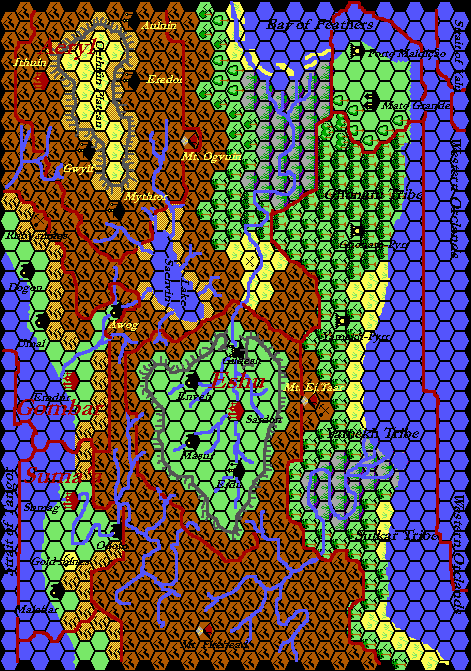 Thibault abandoned Grid’s built-in road and river feature in mid-September 1999, just before he worked on this map. So this is likely one of the first he did with his new system, drawing the line-work manually in Paint Shop Pro. He used this technique to draw not just the roads, rivers, and borders, but also the coastlines and plateaus. The only problem with this was that it ended up deleting parts of the hex grid. I have touched up these parts where possible using the original terrain files.