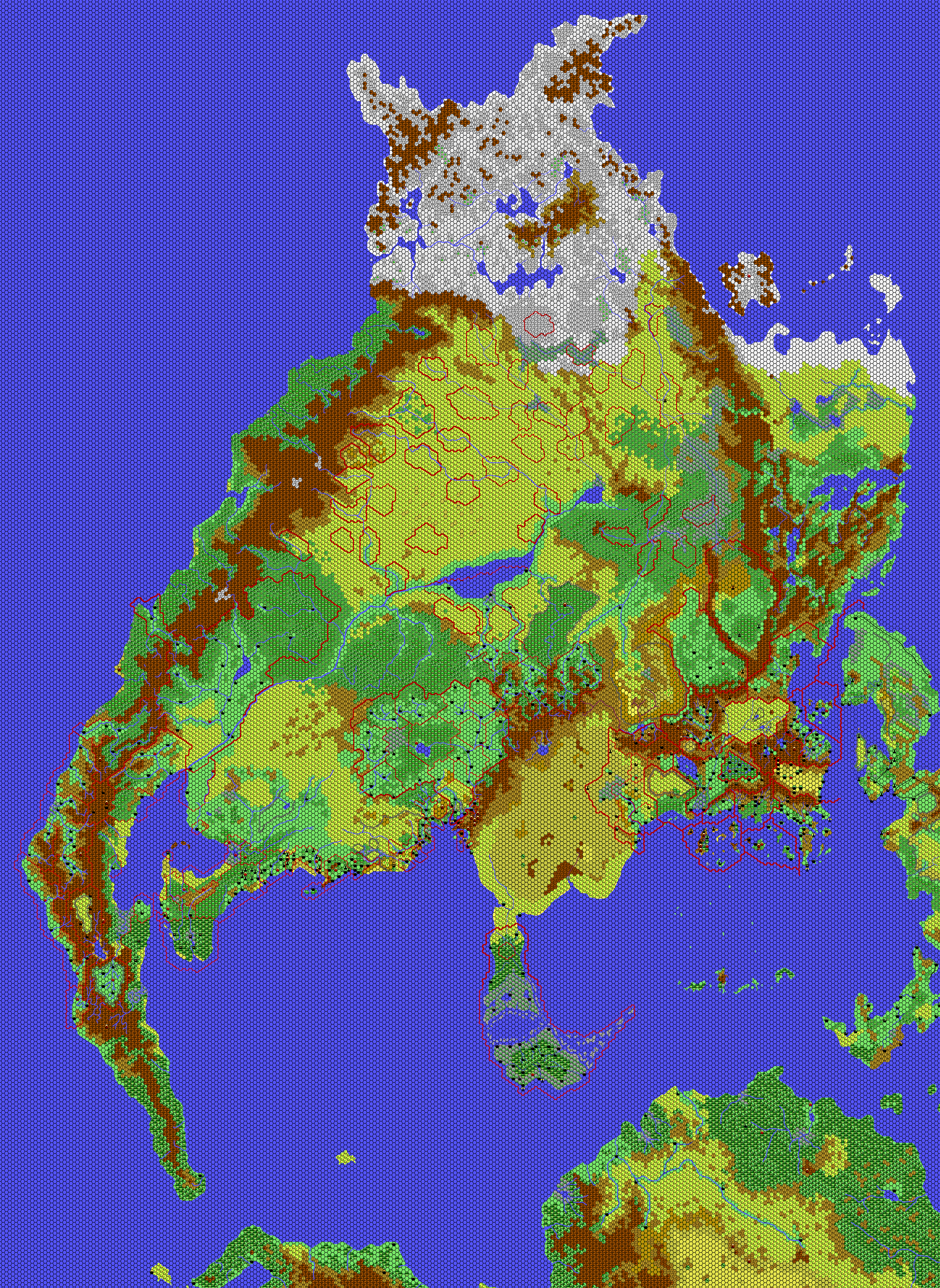 One year after his partial combined map of Brun, Thibault posted his final map of the continent. It’s a stunning achievement: for the first time ever, a complete, contiguous map of Brun at 24 miles per hex. Amazing!