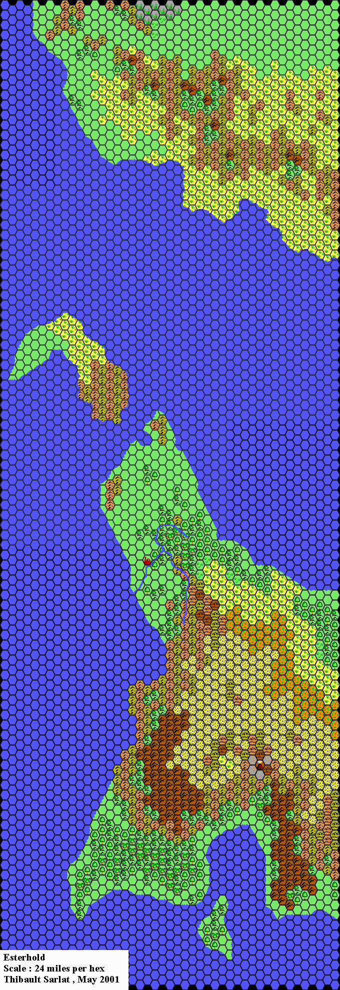 Thibault completed the base terrain for this map as early as December 2000, but he didn’t add the rivers and publish it until six months later. Nevertheless, it was still the first map to show the Esterhold Peninsula at this scale. As with other parts of Skothar, Thibault developed it from all available official sources plus his own ideas, Christian Constantin’s Skothar, and Giulio Caroletti’s Skothar gazetteers.
