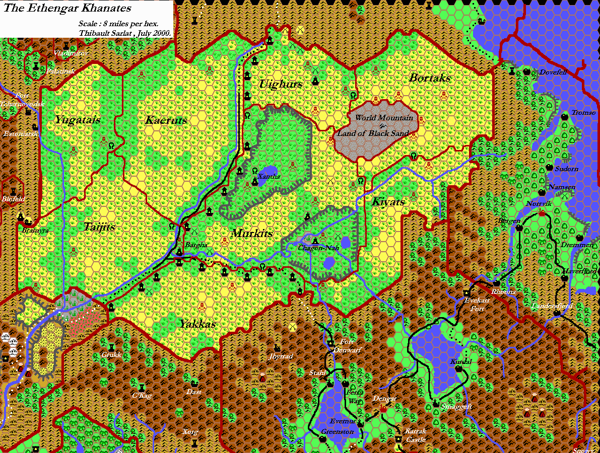 This is a fan-made map. It was published in August 2000 and revised in September 2001. The updated Atlas version of this map is Ethengar, 8 miles per hex. See also Appendix C for annual chronological snapshots of the area. For the full context of this map in Mystara’s publication history, see the upcoming Let’s Map Mystara 2000 and 2001.
