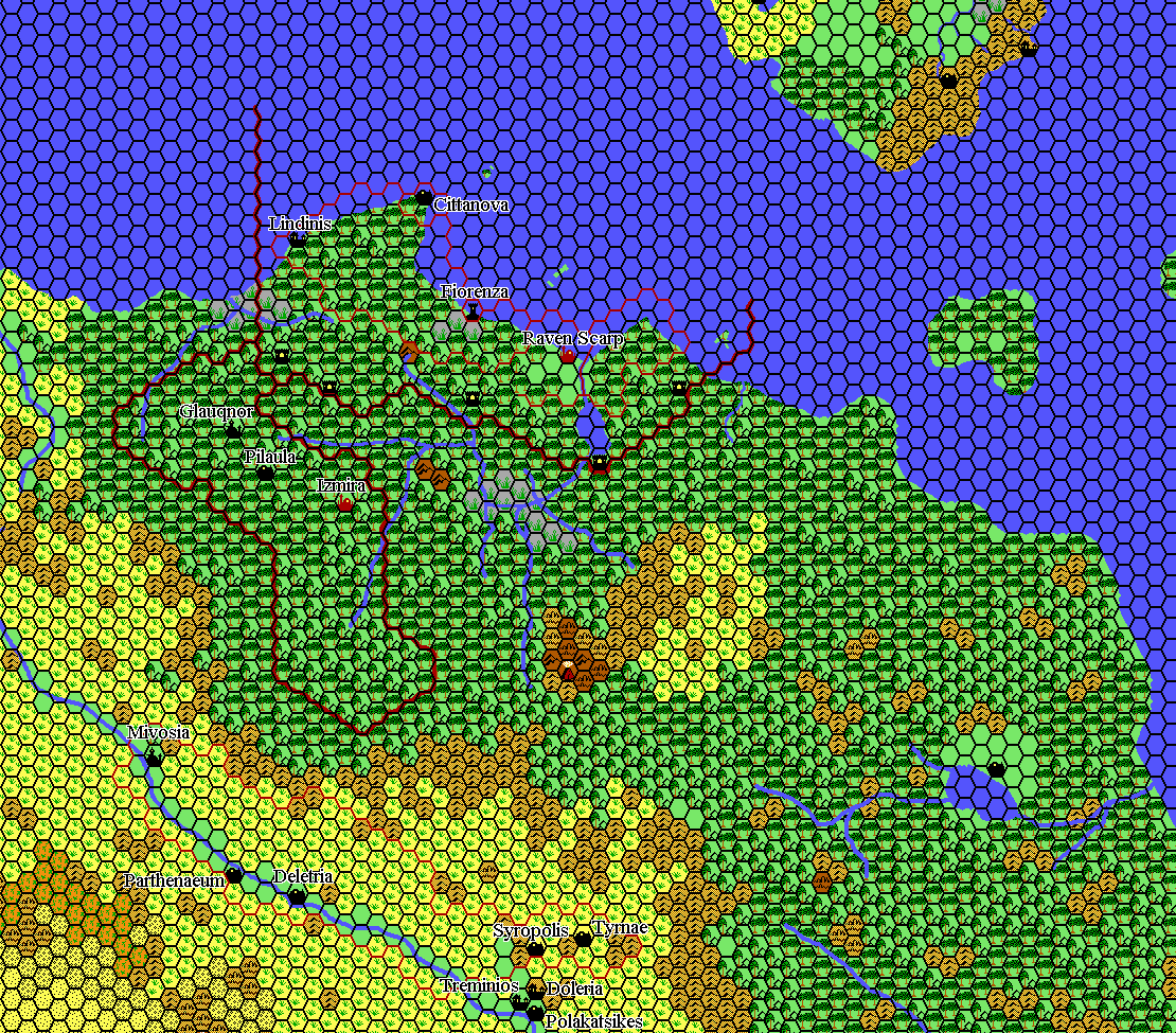 Beginning in late 2002, Thibault did some quite extensive work developing the area of northeastern Davania around the Thyatian Hinterlands. The cities of Mivosia and Polakatsikes are located due south of the Hinterlands, part of the Milenian city states region depicted on the edge of Poor Wizard’s Almanac II’s map.