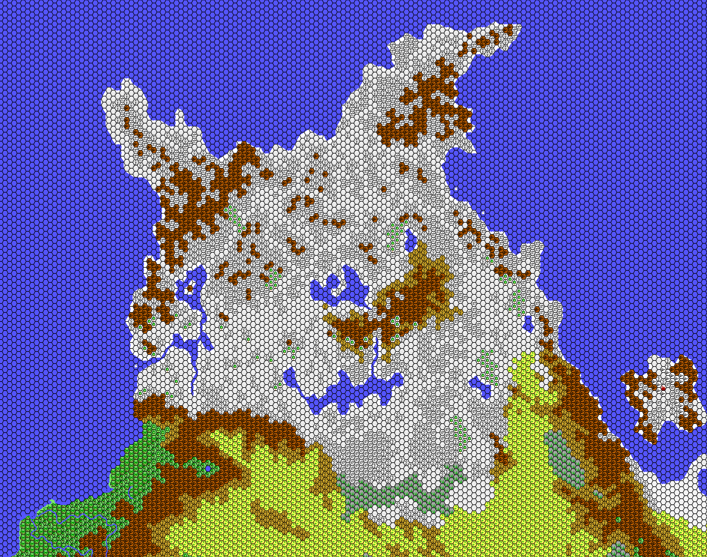 Towards the end of 2001, Thibault was approaching full coverage of the continent of Brun at 24 miles per hex. Consequently, he began work on the missing sections of map he needed to complete the project. One of these was Brun’s northernmost tip: Hyborea.