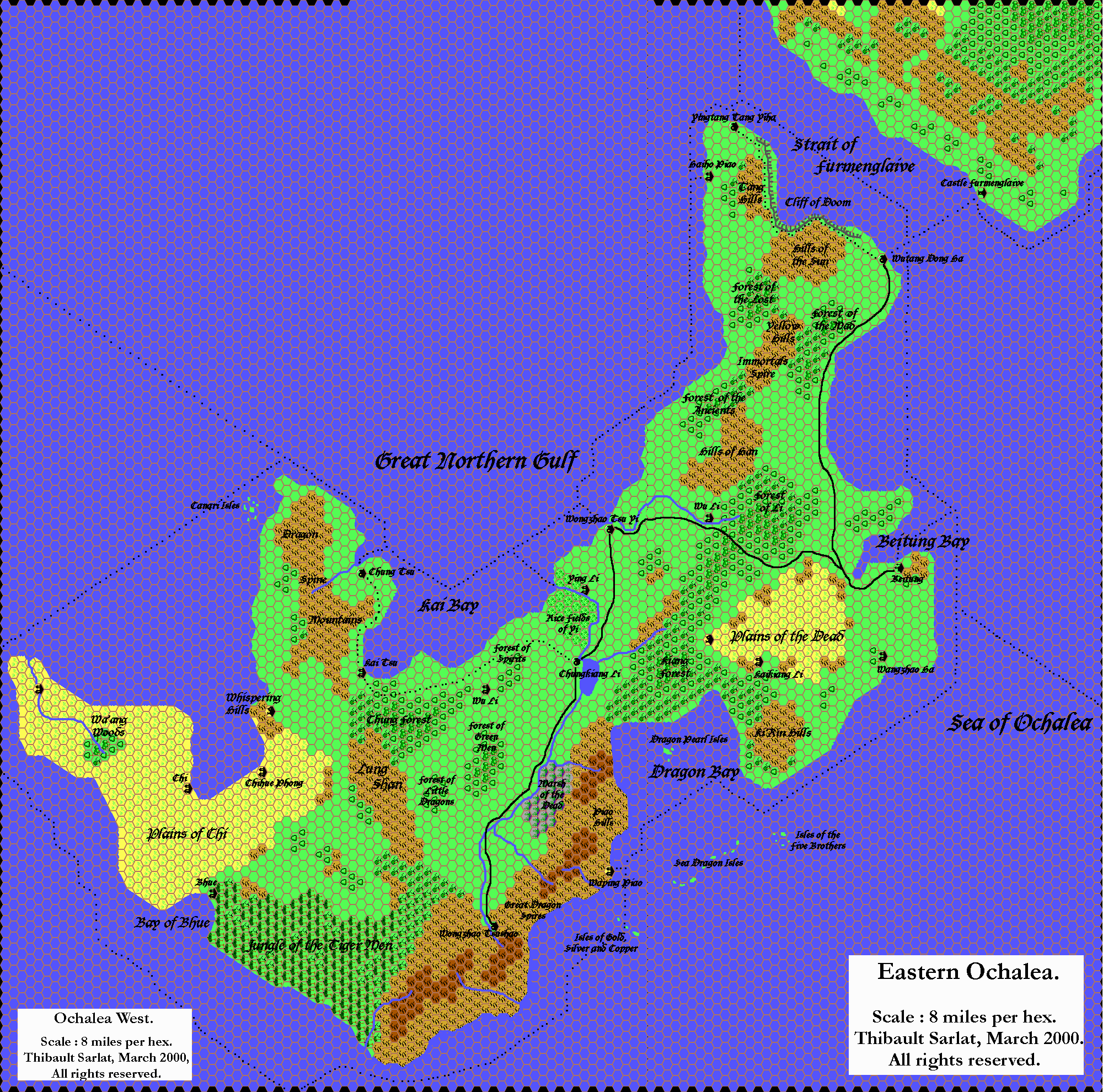 Thibault created three maps for Tome of Mystara Volume 3 in March 2000. Two of these were the eastern and western halves of Ochalea at 8 miles per hex.