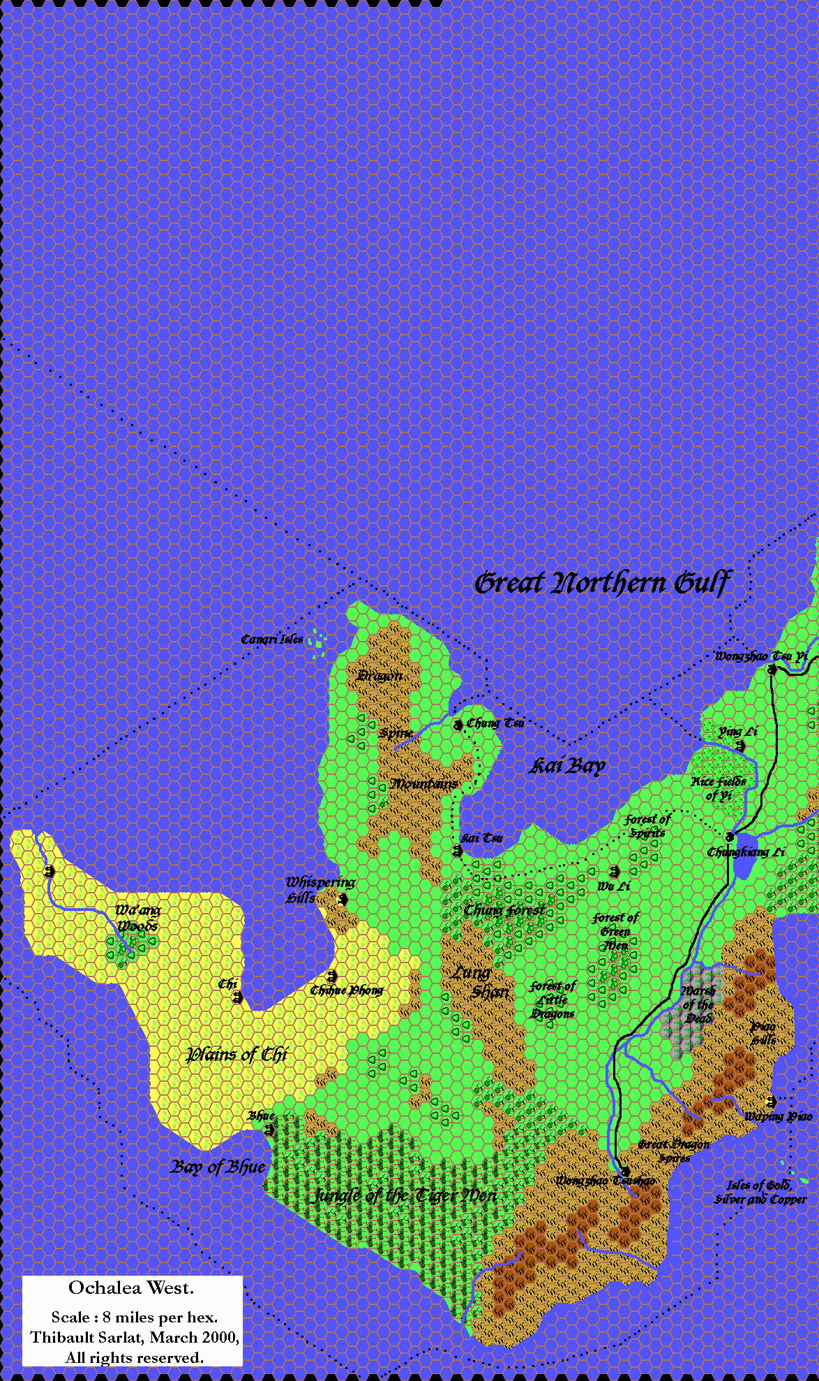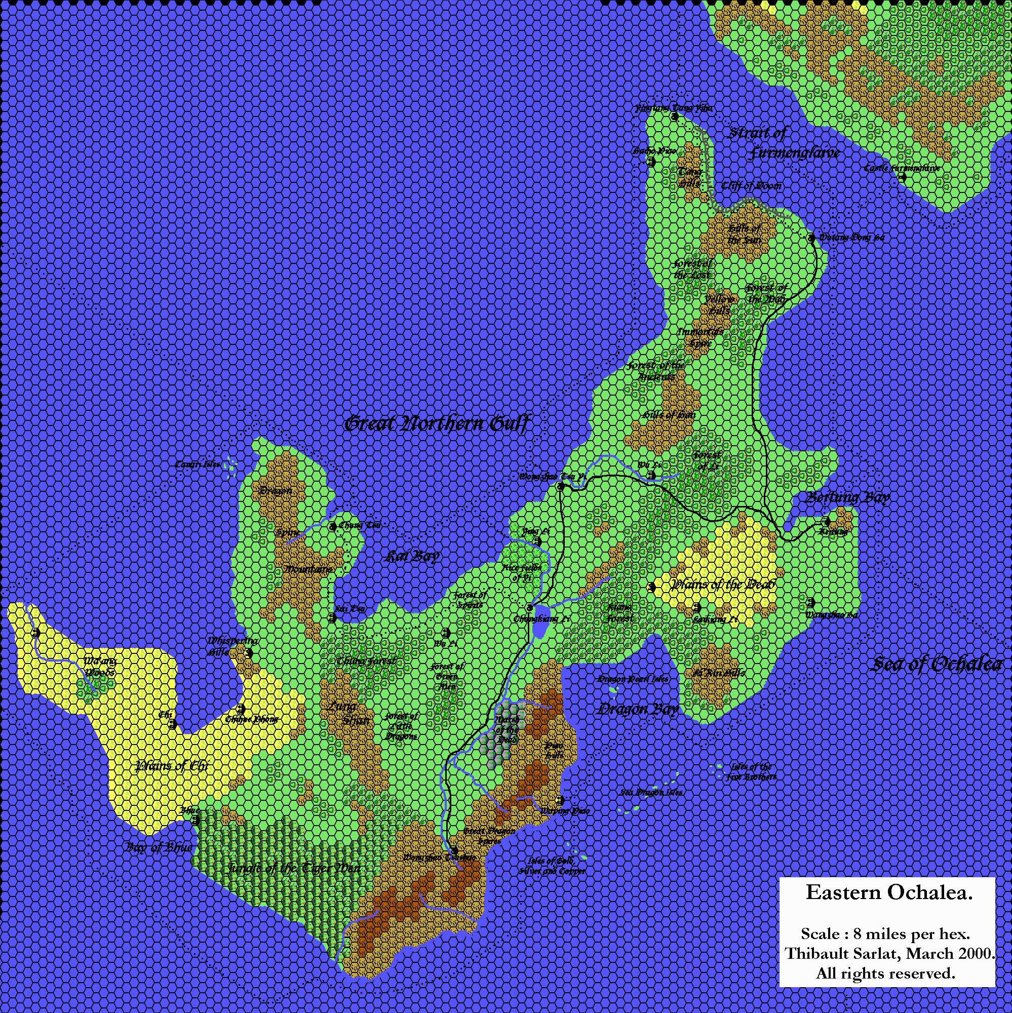 These were the first hex maps of Ochalea produced at this scale. Thibault based his maps closely on Mystaros’ Isle of Ochalea maps, as well as Dawn of the Emperors.