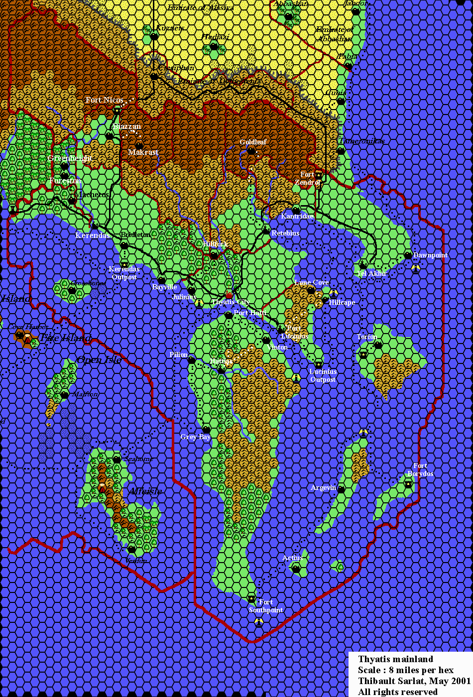 This is a fan-made map. It was published in August 2000 and revised in May 2001. The updated Atlas version of this map is Thyatis, 8 miles per hex. See also Appendix C for annual chronological snapshots of the area. For the full context of this map in Mystara’s publication history, see the upcoming Let’s Map Mystara 2000 and 2001. (Please note that it may be some time before the project reaches this point.)