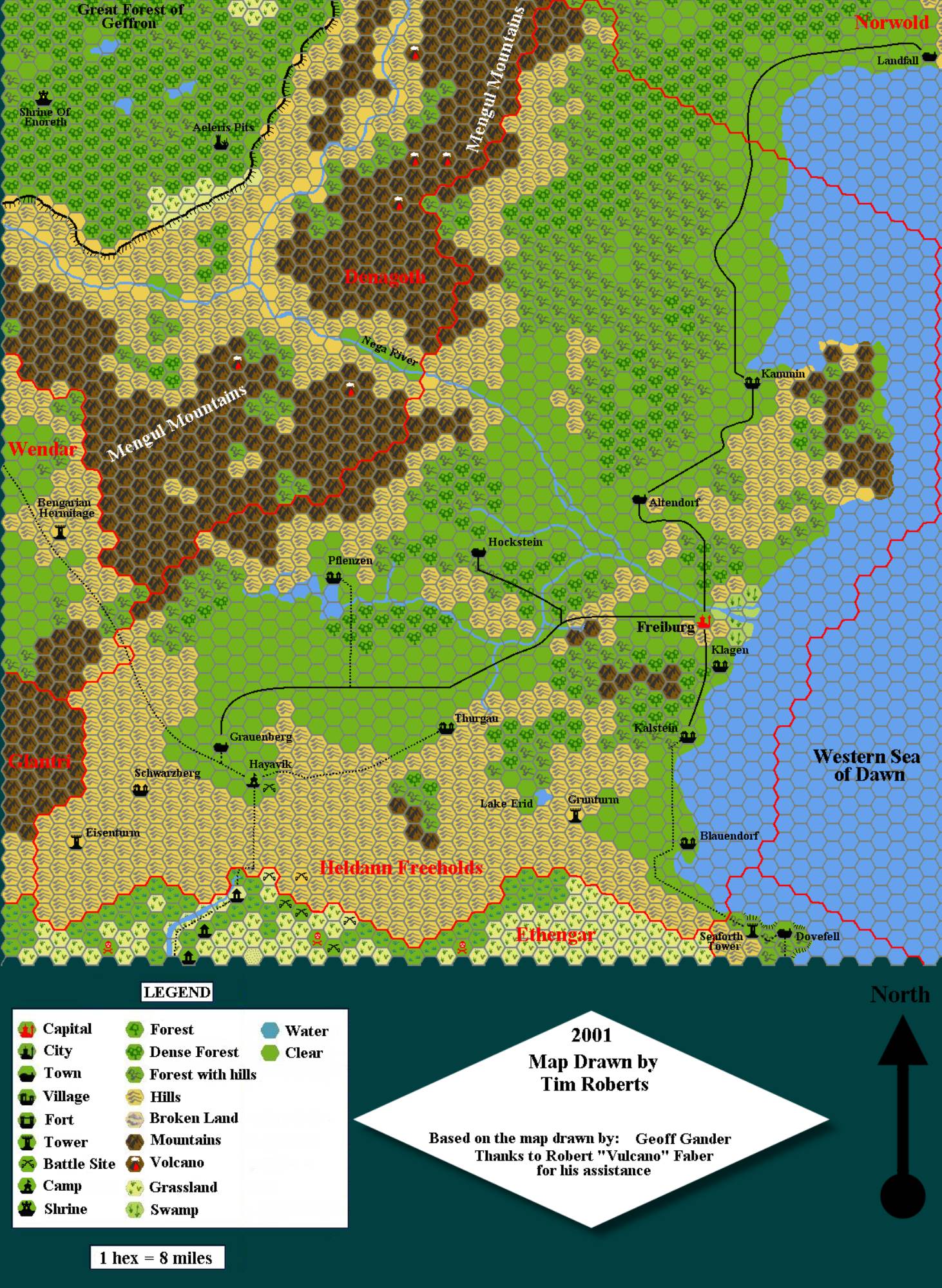 This is the last of Tim’s Known World maps. It’s separated from the others in style, using a different font, slightly different colours, and even a different resolution — the hexes are a different size. It also includes parts of the surrounding nations, which his previous maps did not. All in all, Tim’s Heldann was clearly intended to be a stand alone map, although it is also compatible with the rest of his series.