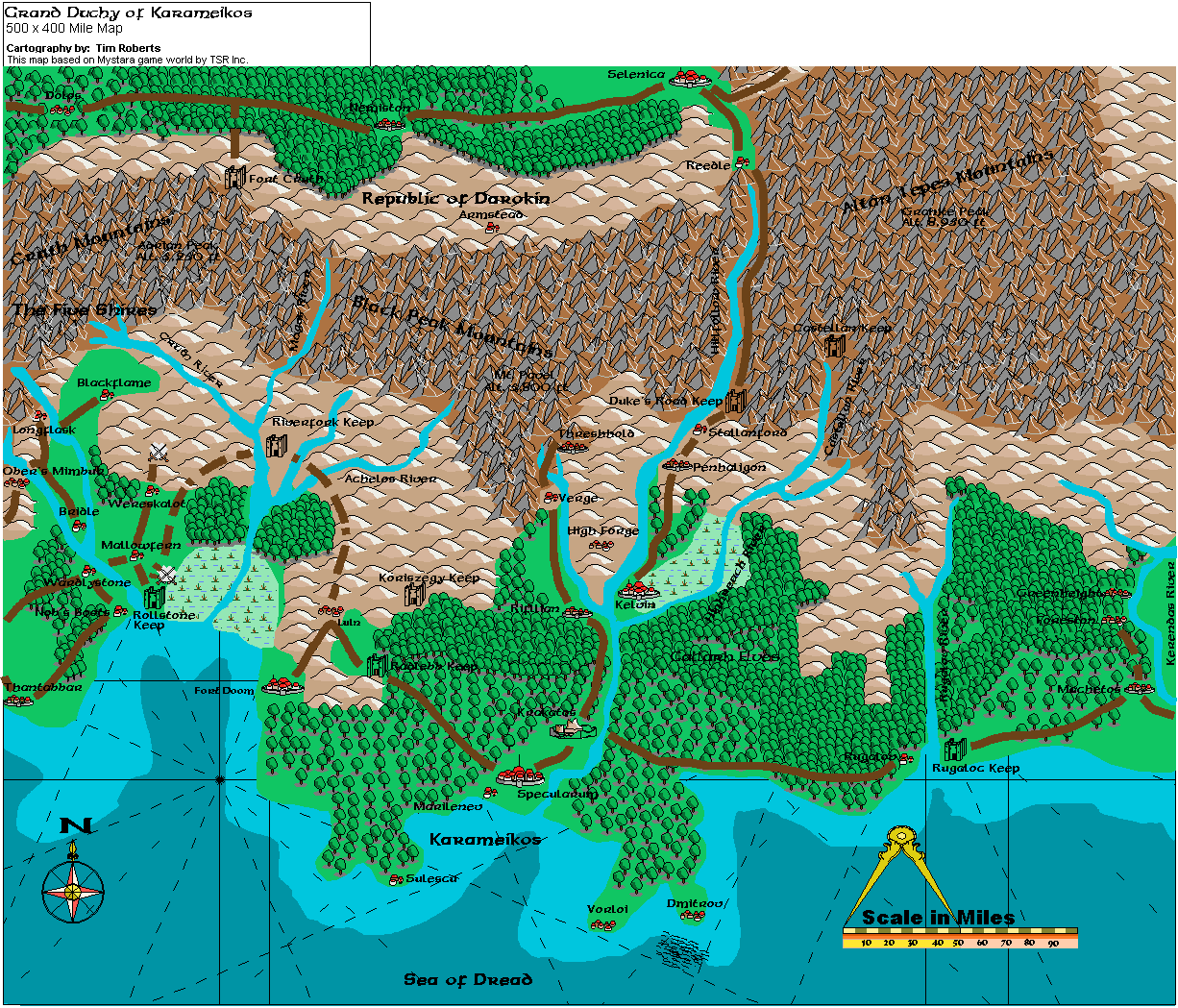 Tim Roberts created three maps of the Known World using Campaign Cartographer 2 in 1998. As far as I can tell, he wasn’t active on the Mystara Mailing List at the time, although he did post there a few years later. Instead, his maps were shared by another fan and MML member, Patriarch.