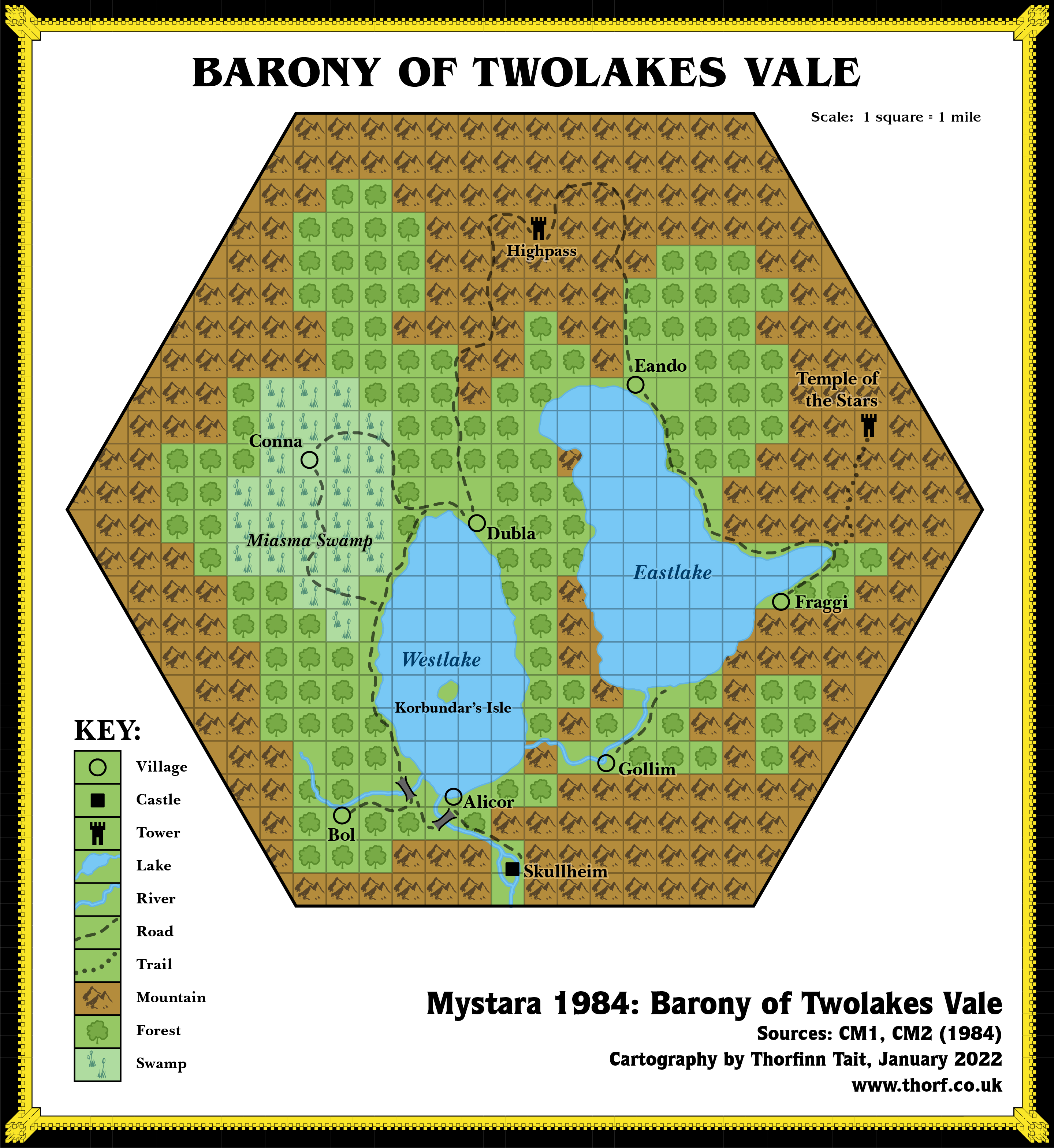 There are also two versions of the map, showing the area before and during CM2’s adventure. These correspond to the Players’ and DM’s maps respectively. Those with the Miasma Swamp are chronologically later.