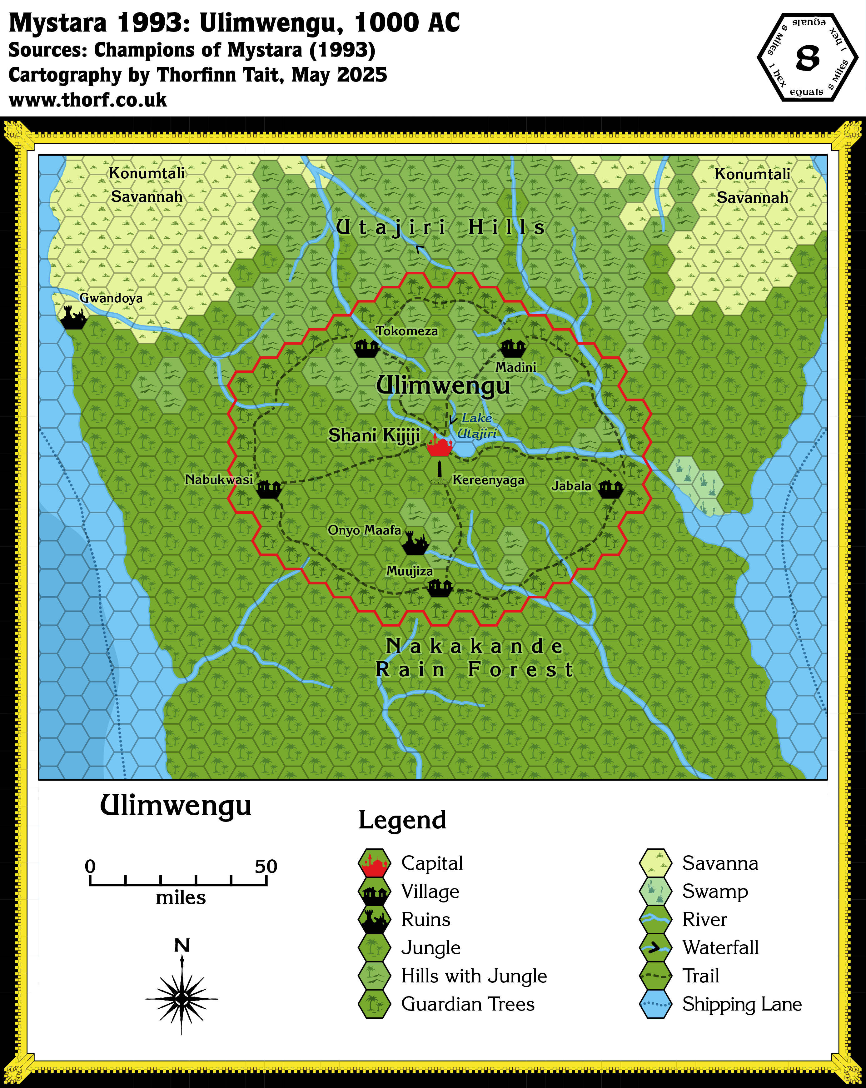 Although the map of Ulimwengu in Champions of Mystara was not a hex map, it nonetheless felt familiar in scale — equivalent to an 8 mile per hex map. Overlaying it with an 8 mile hex grid confirmed this, and so I have decided to convert it to hexes in my updated Chronological map of Ulimwengu, below.