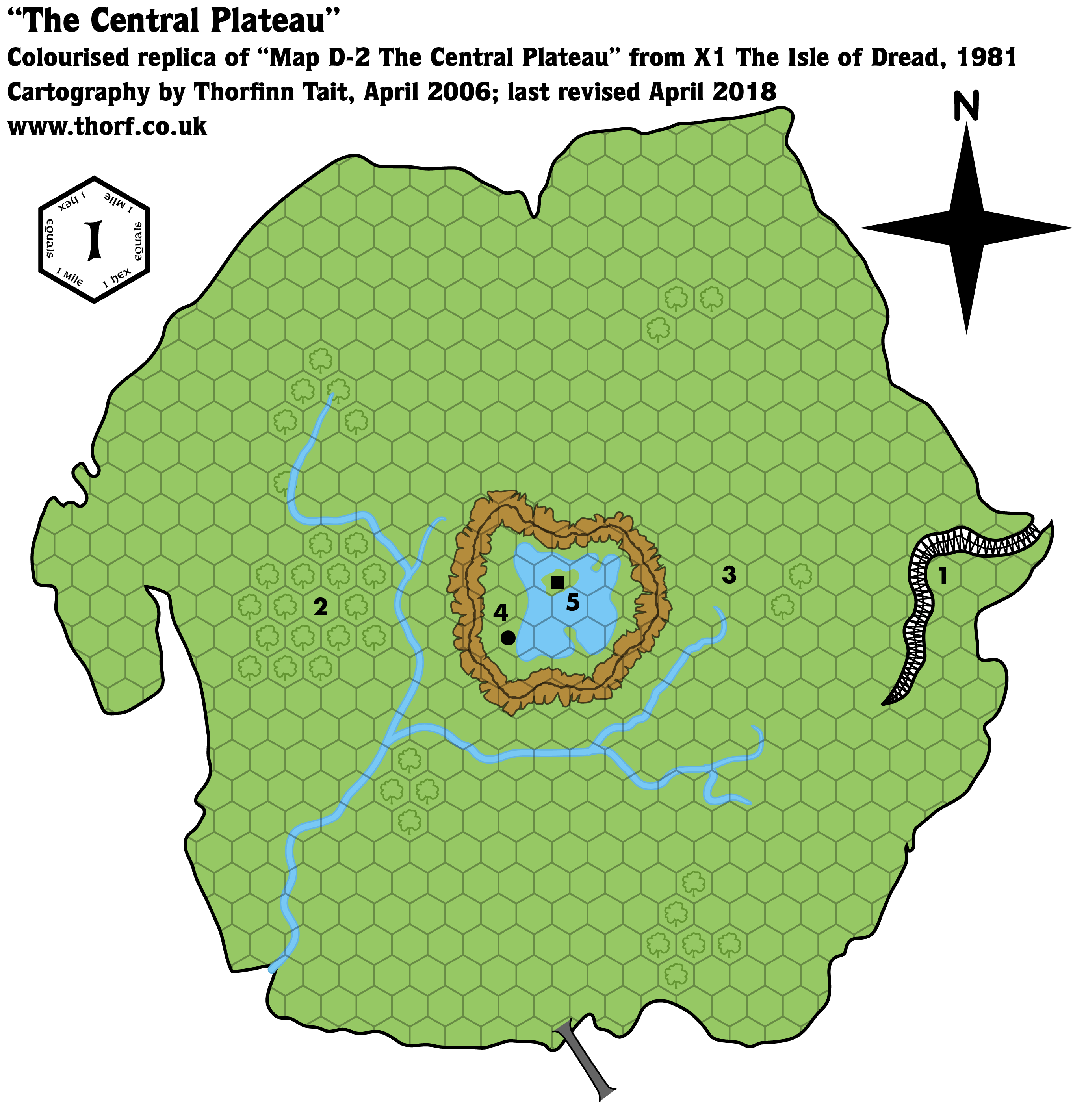 - Plateaus— the shape of the Central Plateau is a refined version of the shape on the Isle of Dread map. Note that at the scale of 1 mile per hex it doesn’t exactly match the size of the smaller scale map’s plateau; in fact it turns out to be a little larger. (See Scale below.)