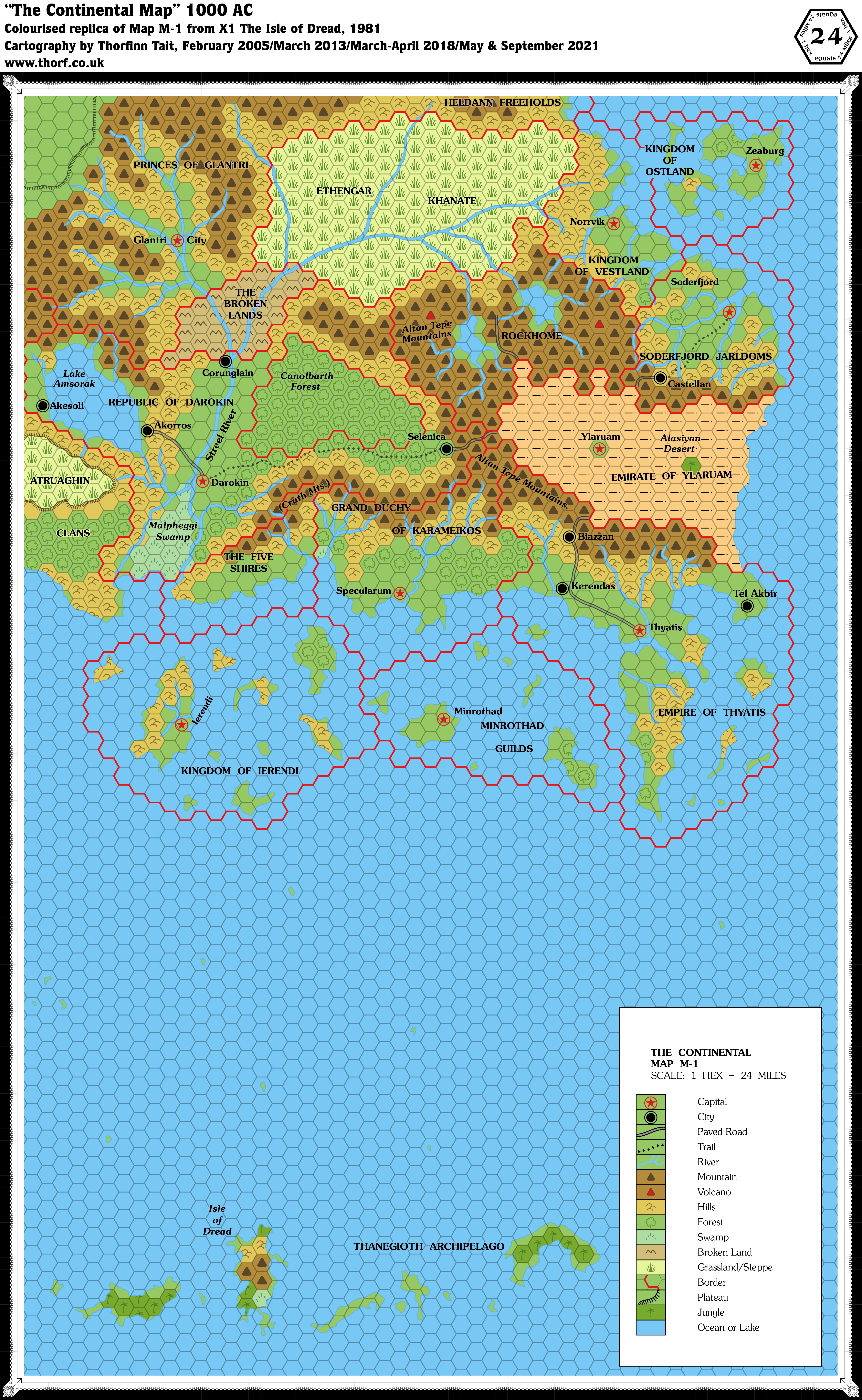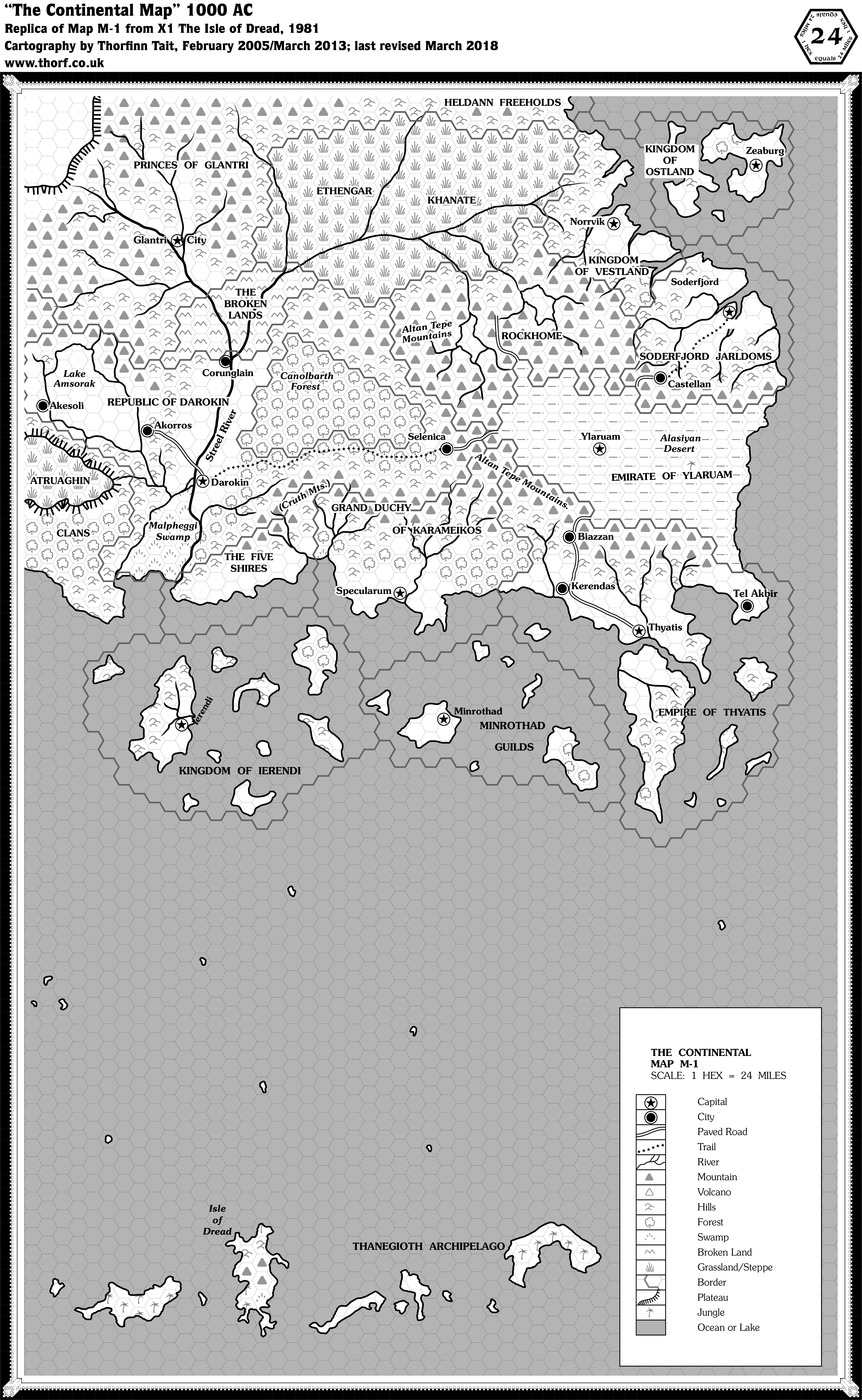 The map appeared as a two page spread in X1. 1983’s reprint added a few missing names (most notably Alfheim) and smaller towns (such as Threshold), while the Expert Rules Set (1983) reproduced the northern half of the map on a single page, cropping the Sea of Dread and the Thanegioth Archipelago while adding trails and a few other details.