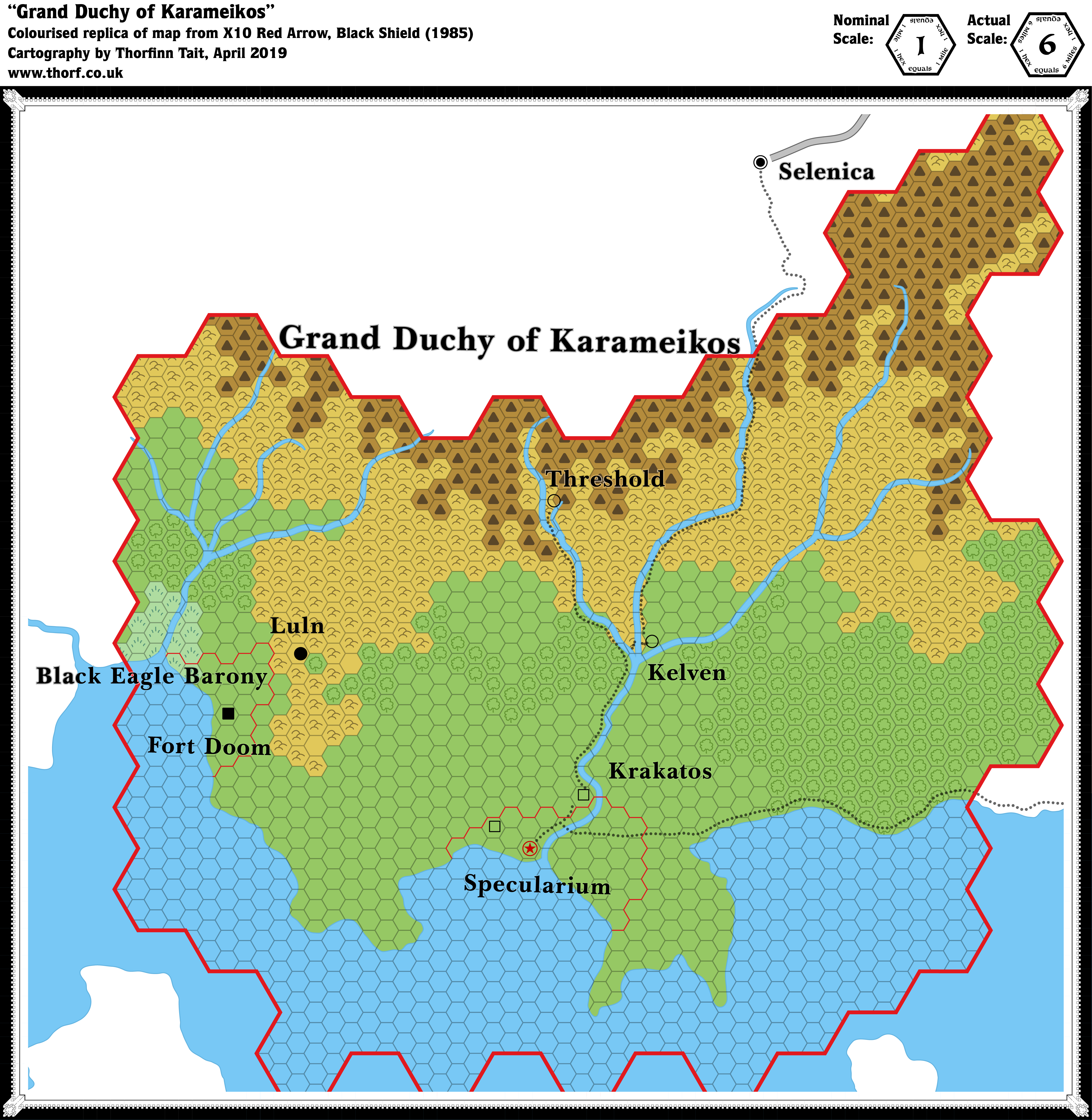 - Scale — The map’s legend includes the note “1 hex equals 1 mile”, but this is patently incorrect, as this is clearly a direct adaptation of previous maps labelled 6 miles per hex.