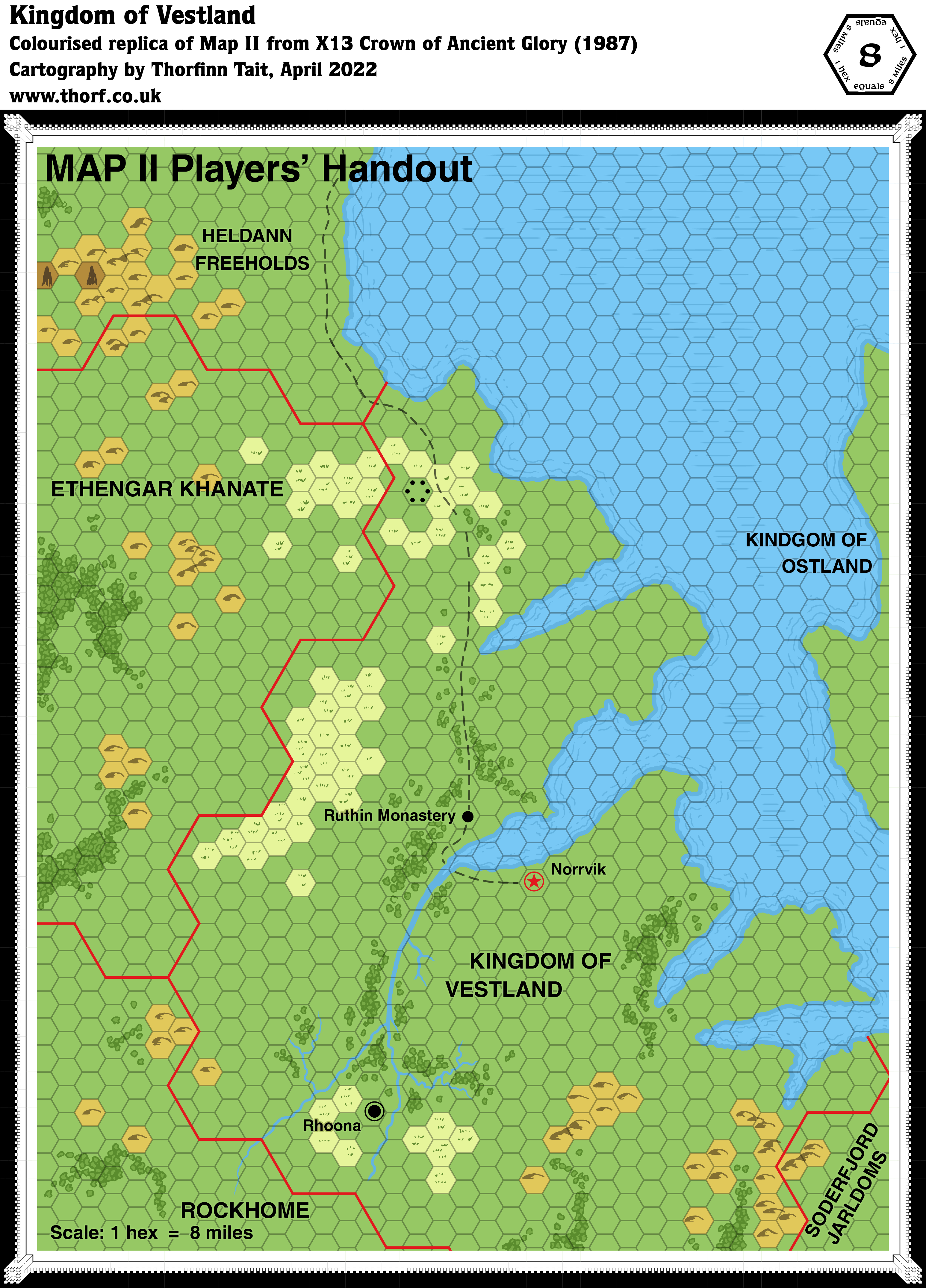 X13 appeared at the end of 1987, about 6 months before GAZ7 The Northern Reaches provided a detailed writeup of Vestland and its neighbours. By this time, the Gazetteer series was of course well underway, and perhaps this is why X13 used the 8 mile per hex scale. However, that is where any similarities to the Gazetteer maps ends. For a start, there should be three hexes to each 24 mile hex, not four — making this map’s actual scale 6 miles per hex.