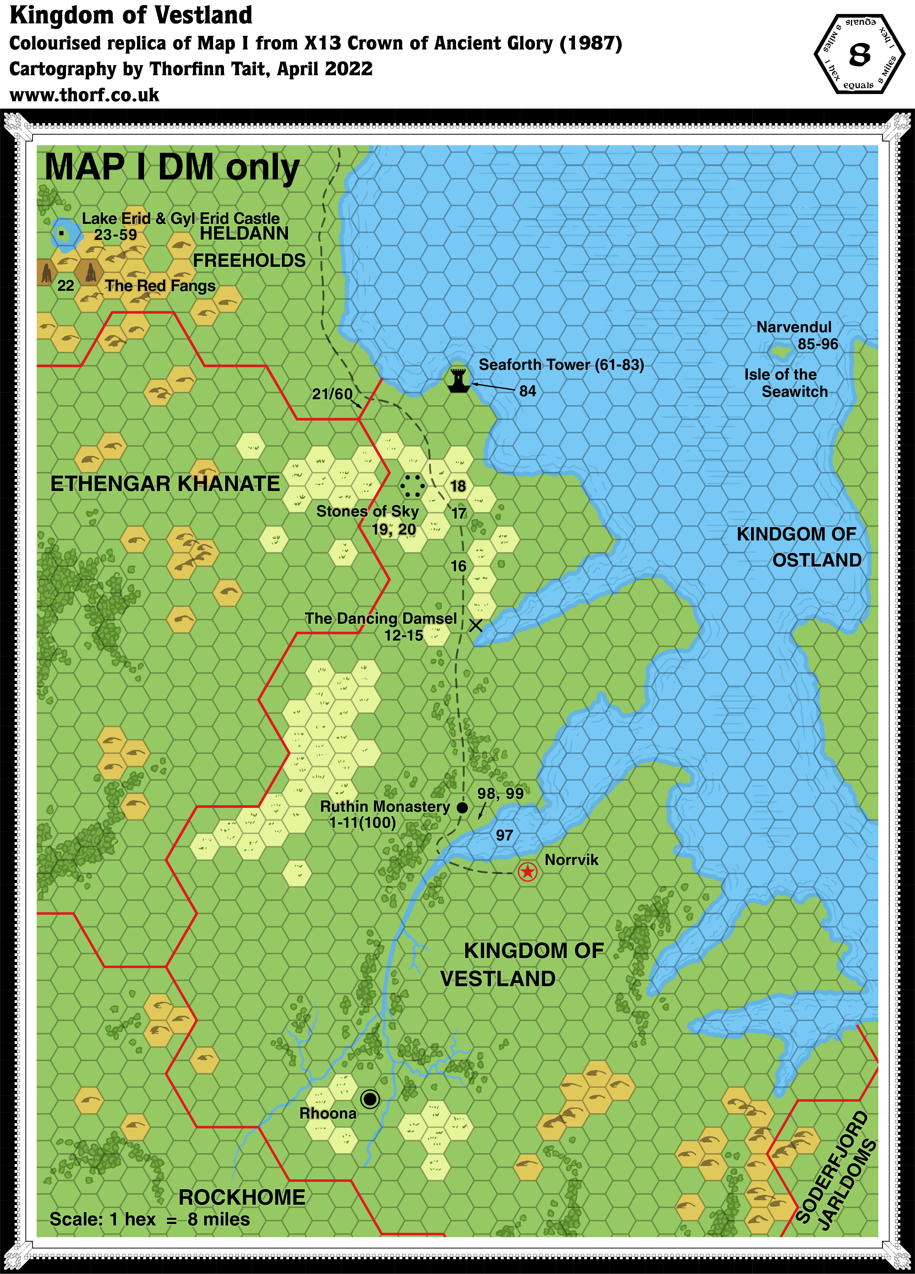 In fact, this map is highly problematic, because unfortunately it doesn’t line up well at all with previous (or indeed subsequent) maps. Comparing with previous 24 mile per hex maps of the region, the coasts, borders, settlements, and indeed pretty much everything is out of sync or just different. Taken on a local level, it should be possible to reconcile some of these details with other maps, but as a whole it seems like a bit of a lost cause. For example, the borders between Vestland and Ethengar/Rockhome are way out, and the terrain given to the latter two nations is wildly different from that shown on all previous maps.