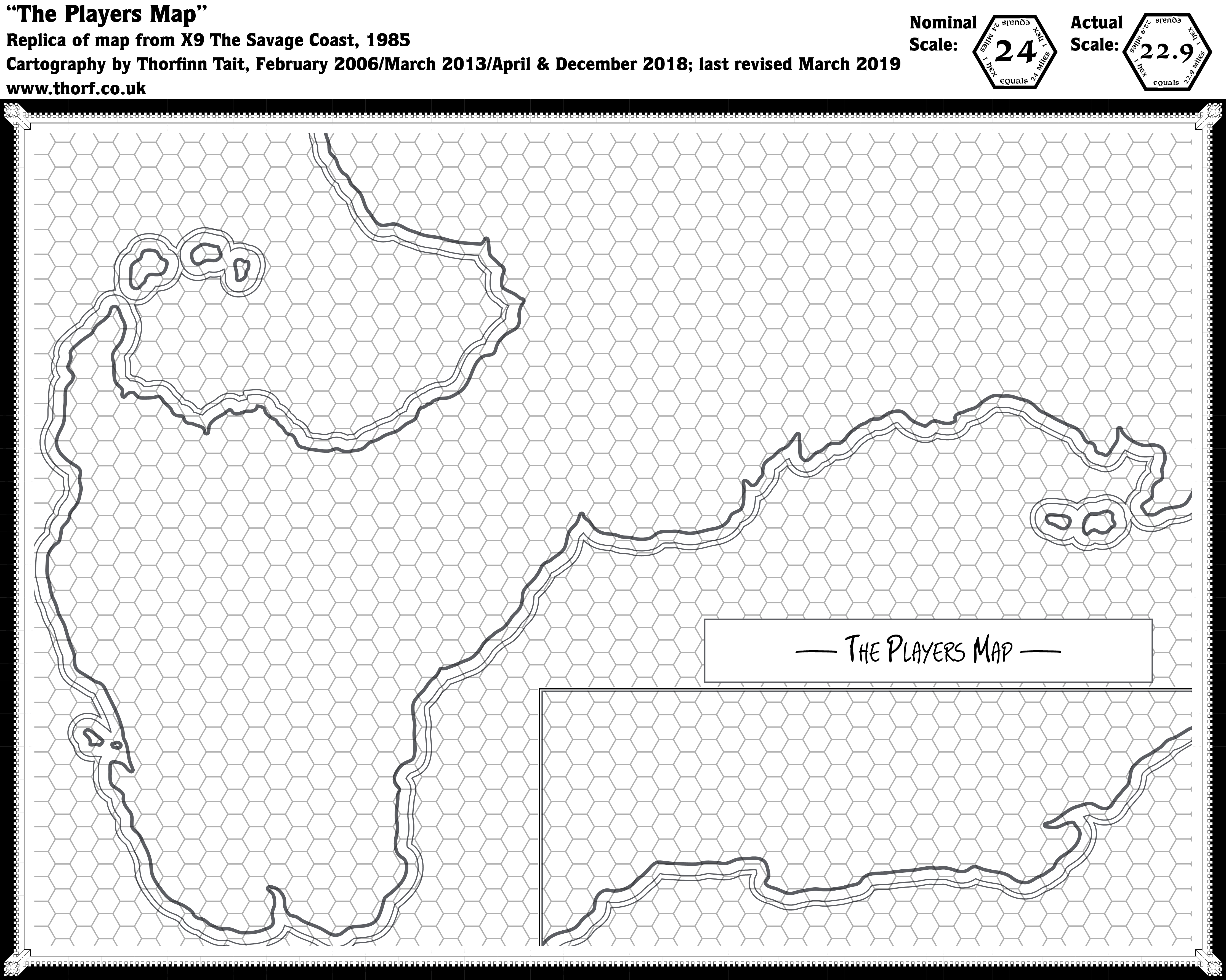 Note: though labelled 24 miles per hex, this map was actually 22.9 miles per hex. For a redrawn 24 mile per hex version, see Savage Coast, 24 miles per hex (1985).