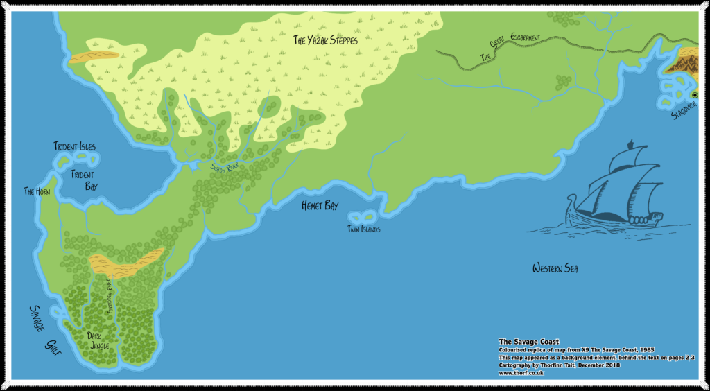 Ironically, the most complete map of the Savage Coast area included in 1985’s module X9 The Savage Coast was not so much a map as a background to the opening pages of the module. Despite the pages’ text obscuring much of the map, it nevertheless depicts the whole area, from Slagovich in the east to the tip of the Orc’s Head Peninsula in the southwest, from the Great Escarpment to what would later be named the Grass Coast of Yalu Bay.